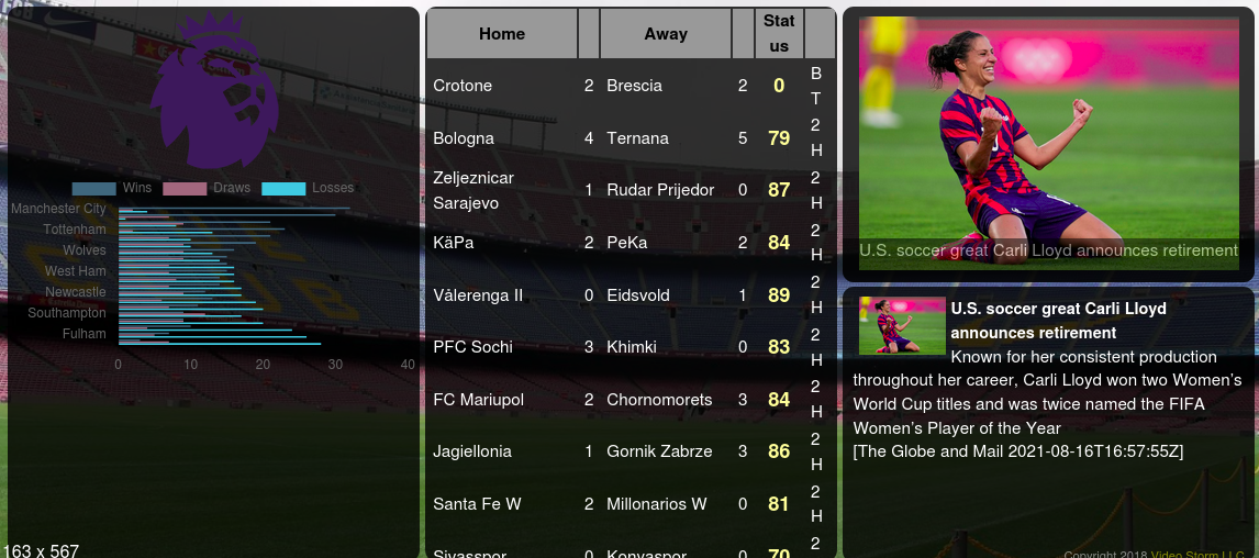 Live Sports Scores are supported in SplashTiles! Soccer, Football, Baseball, Hockey, Basketball, and more. Display as a popup ticker tape when scores update. Tables can give live scores on all of today's games, or just the teams you like. If you are a sports fan, you will love this feature!