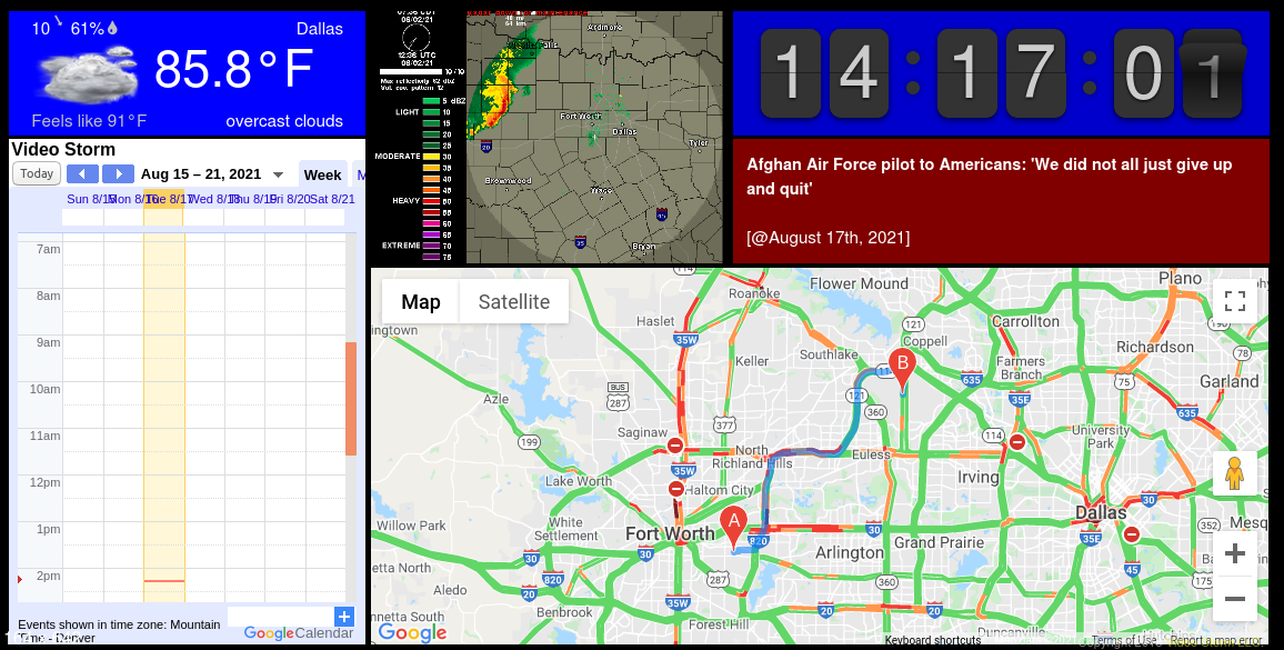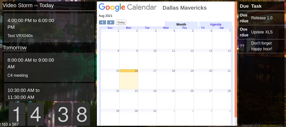 Google Calendar is fully supported and can be displayed as either an embedded "Calendar" view or as an upcoming Events list. For other Calendar sources, SplashTiles supports automatic ICS calendar file path import. Google Tasks is also integrated in SplashTiles.